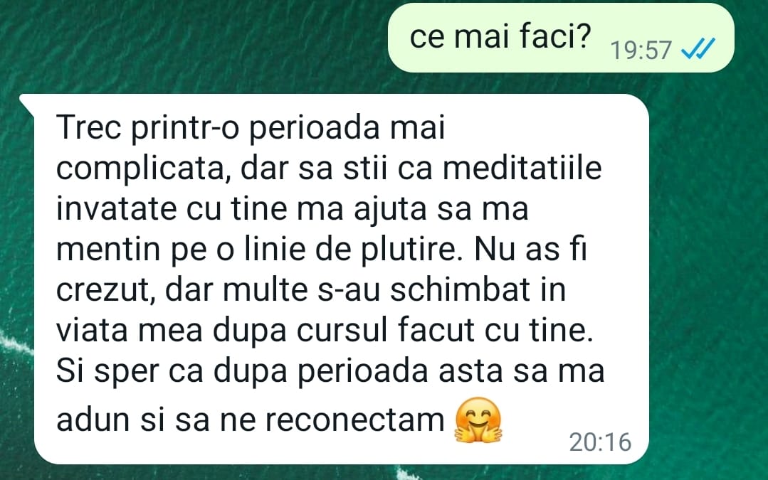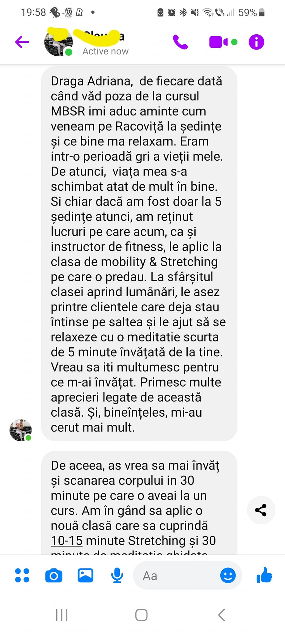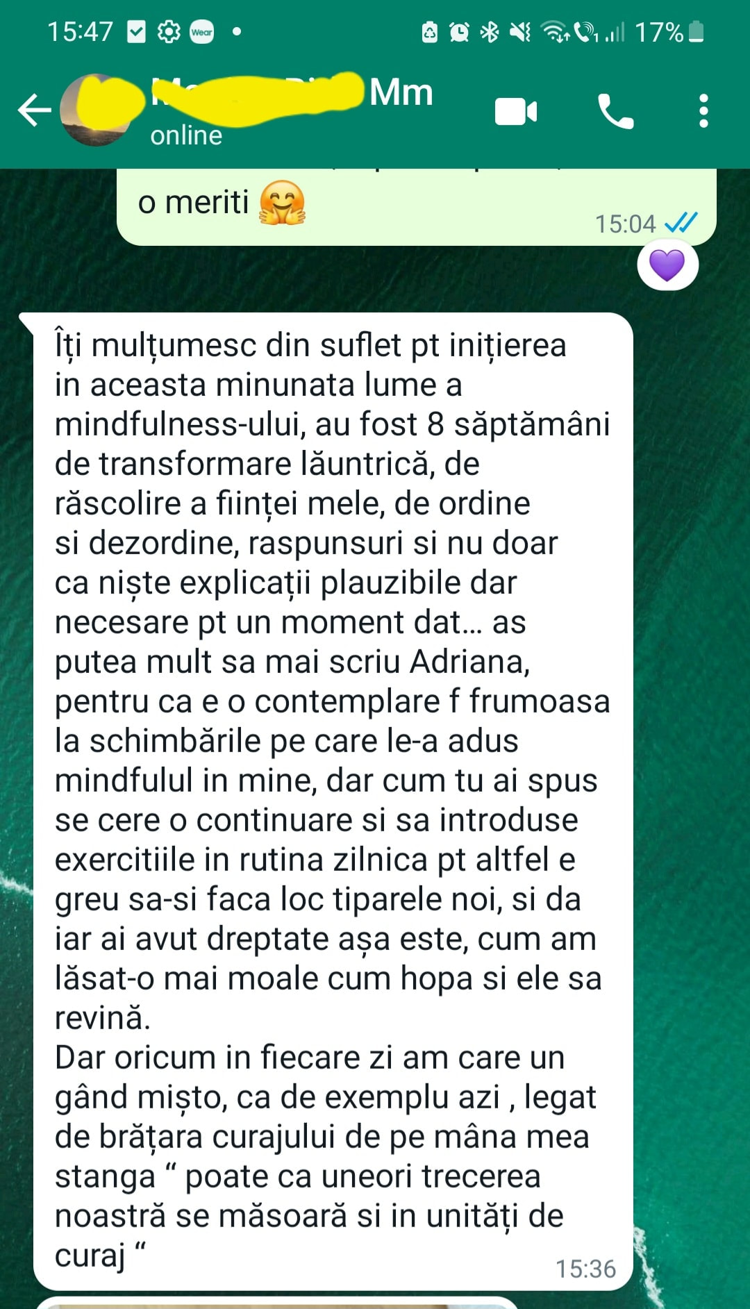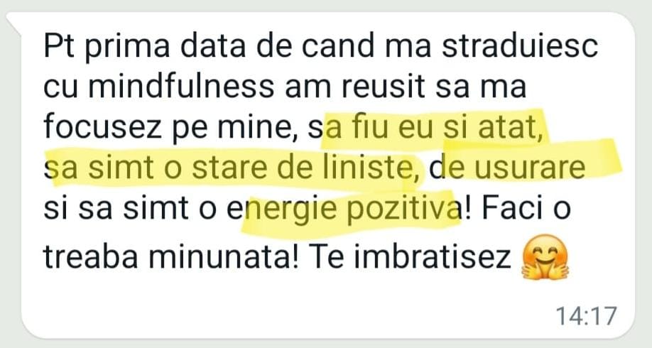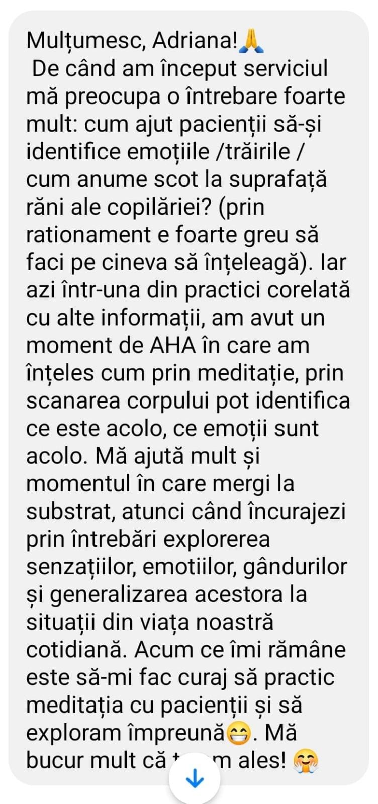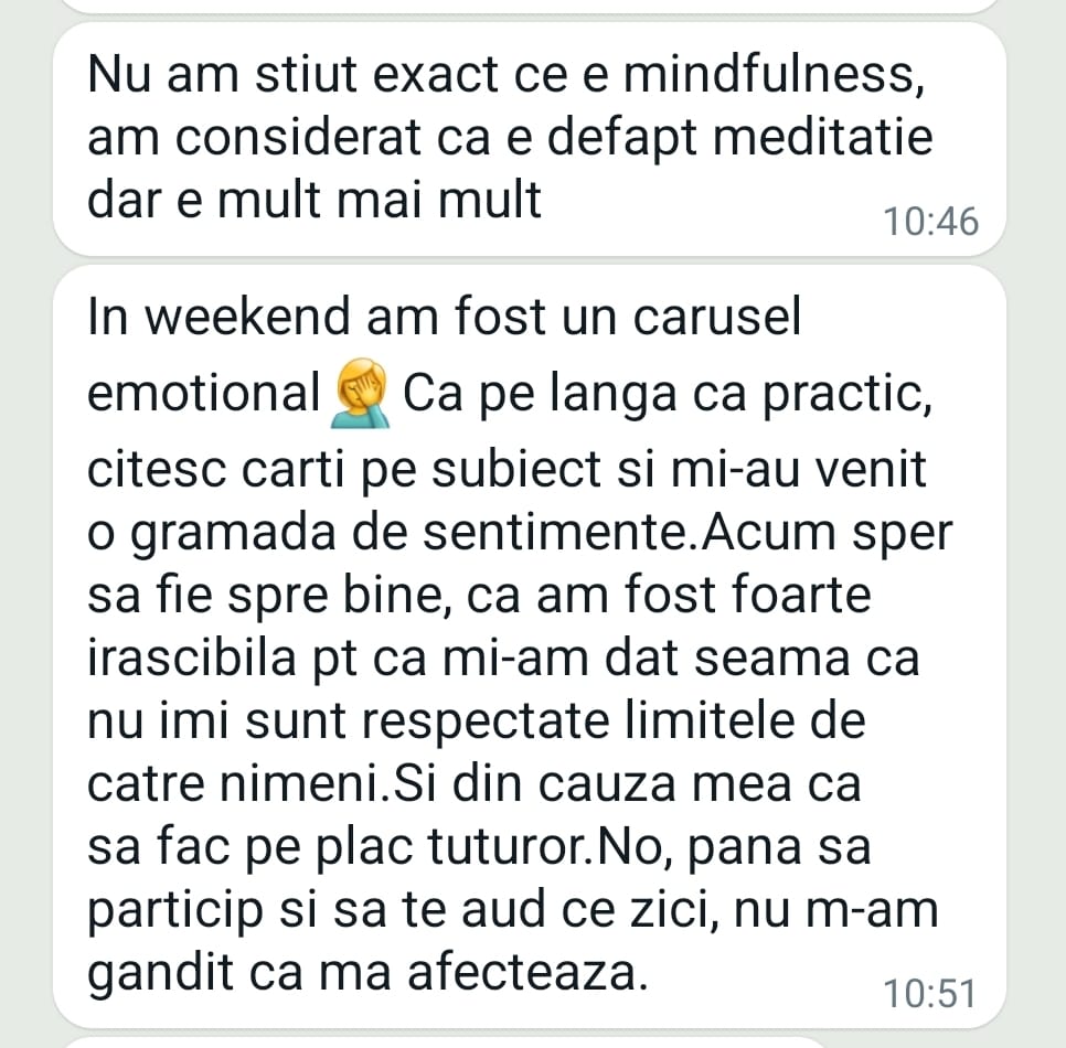 Peste 10.000 de oameni au trecut prin programele mele – din România și din alte țări. Am format peste 200 de psihologi, coachi și terapeuți în mindfulness adaptat la traumă. Sunt psiholog, instructor MBSR acreditat internațional și NeuroMindfulness Coach.